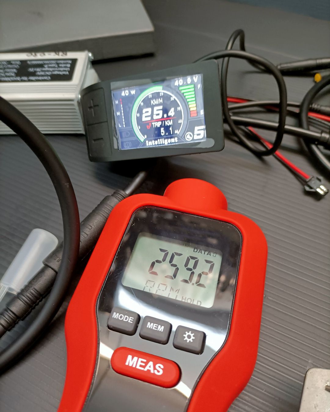 Anche il motore viene testato prima del montaggio su ruota. La prova include tutti i componenti del kit: controller, display, sensore di movimento, leve freno e cavi elettrici di collegamento componenti. Si effettuano: